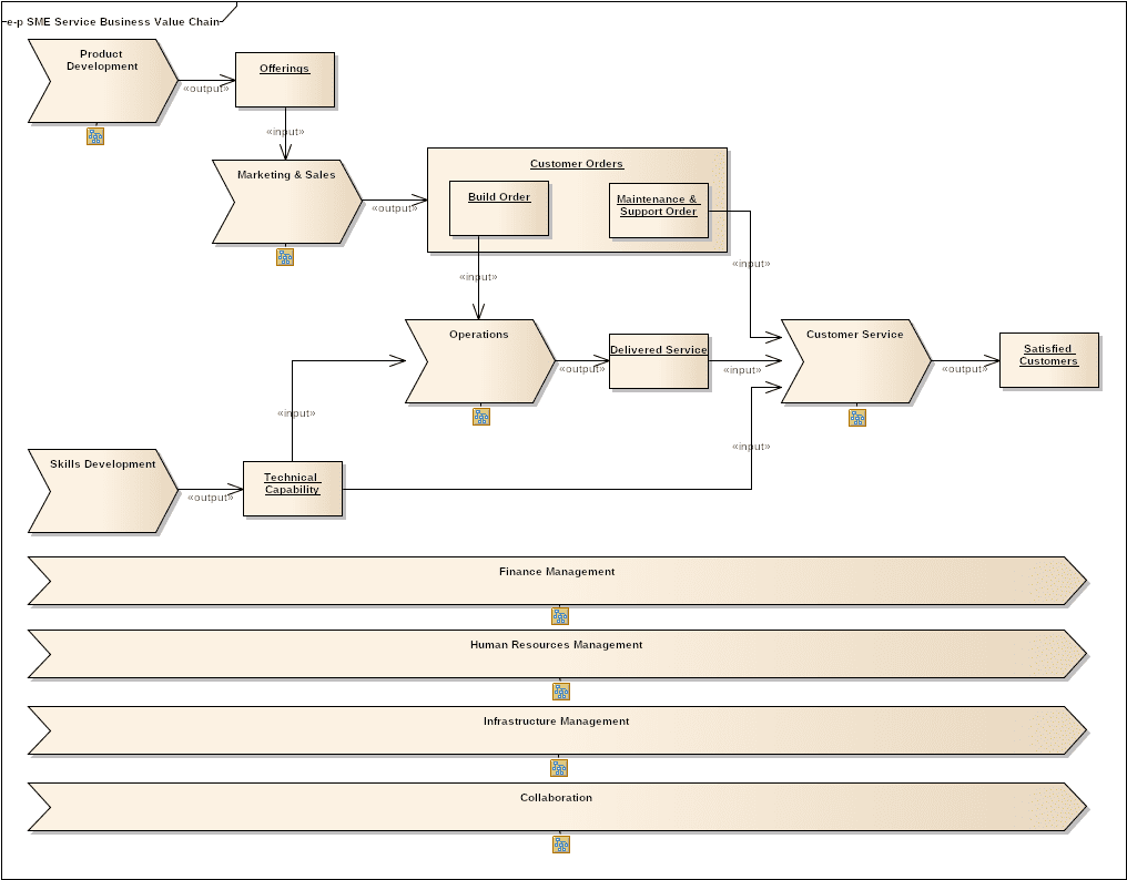Additionally, I have a few pre-baked examples of such value chains that I typically use as a starting point on many projects. Here, for example, is a value chain for a service-based SME business (like ours):